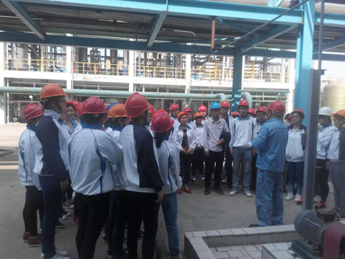 在生产车间,公司技术人员精心讲解、细心回答同学们的提问,同学们对化学工艺及化工生产进行现场参观学习,把学到的理论知识与化工生产实际联系起来,进一步加深了对化工生产和理论的认识。