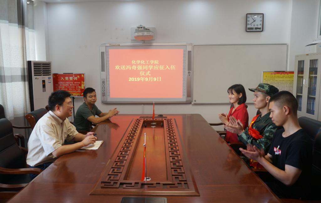 9月9日上午11:00,球王会2019年入伍员工欢送仪式在化学实验楼313会议室举行。化学化工公司党委副书记吴志伟,党委秘书冷向宇,武装干事邓耀辉,新入伍同学和两名退伍复学同学共同参加了欢送仪式。