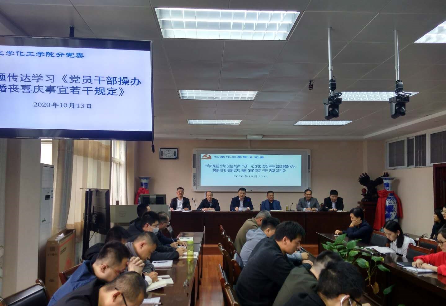 为认真贯彻落实中央八项规定精神,切实加强党员、干部、公职人员纪律约束,10月13日,球王会分党委在实验楼407报告厅召开全体教职工大会,集体学习《党员干部操办婚丧喜庆事宜若干规定(修订)》的通知文件。球王会全体教师集体参加学习。学习会由党委书记郭鹏主持。分党委纪检委员刘鹏针对文件精神进行宣讲、领学和解读。