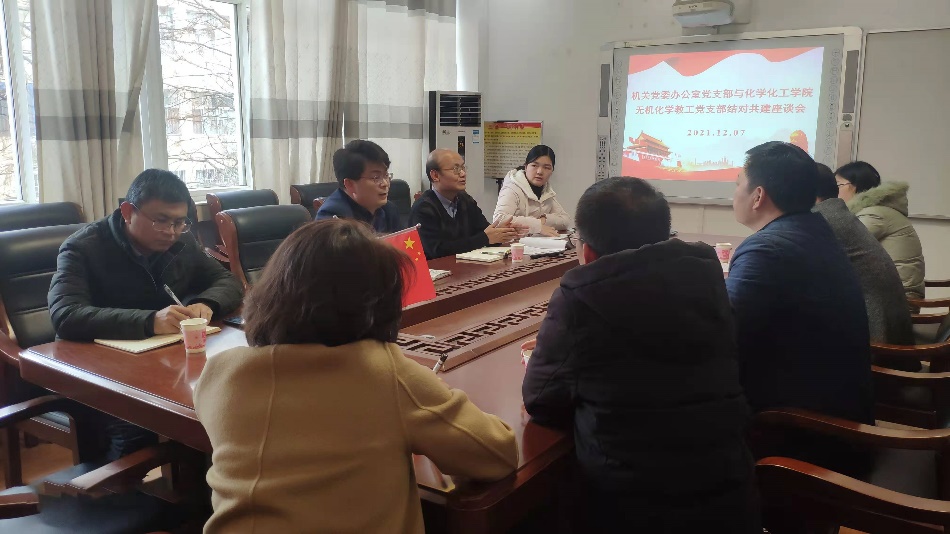 根据《信阳师范公司机关党委各党支部与教学公司党支部、团支部结对共建实施意见(试行)》的安排部署,12月7日下午,机关党委办公室党支部与化学化工公司无机化学教工党支部、2019级化学1班团支部召开结对共建座谈会。机关党委书记朱四倍、副书记徐忠,机关党委办公室王卫杰、范慧珍,化学化工公司党委书记郭鹏、无机化学教工党支部书记邹国栋及支部党员等一起参加座谈会。会议由郭鹏主持。